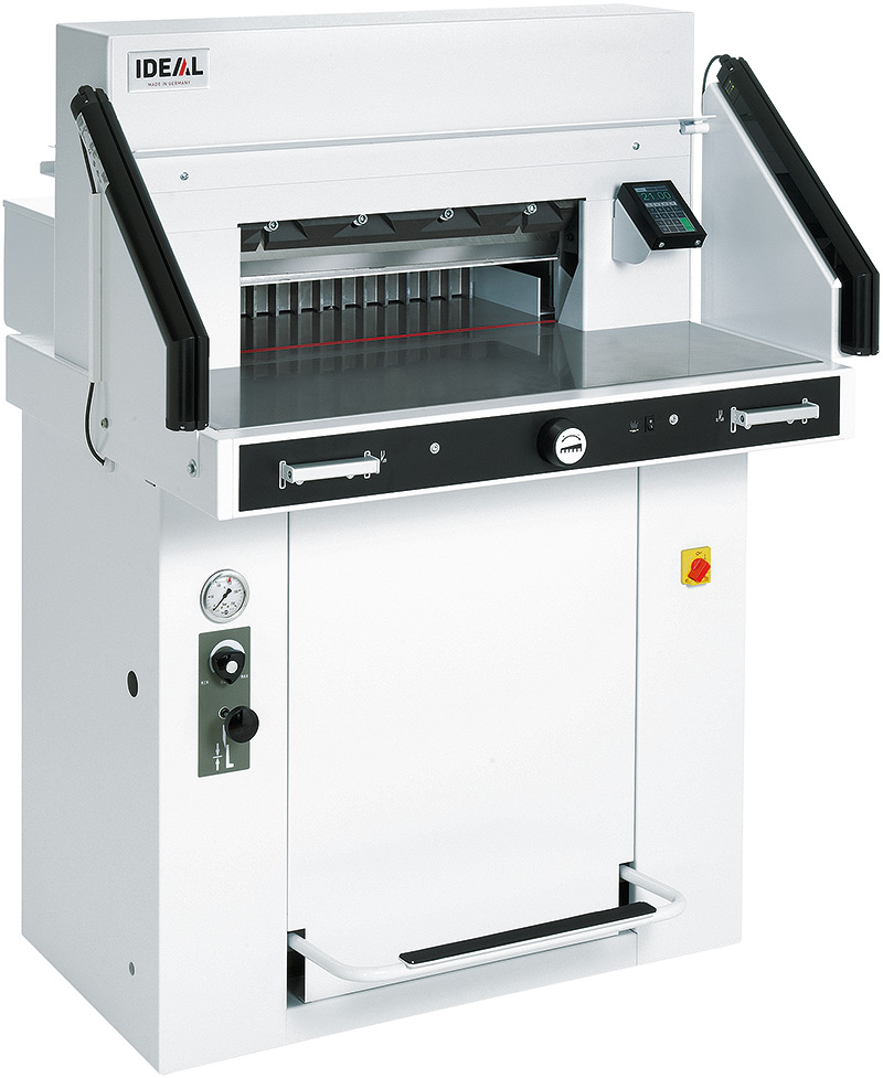 Hydraulischer Präzisionsantrieb für Messer und Pressbalken. Mit neuer, patentierter EASY-CUT Schnittauslösung. Besonders sicher durch SCS – Safety Cutting System: IR-Sicherheitslichtschranke auf dem Vordertisch und Sicherheitsabdeckung auf dem Rücktisch; abschließbarer Hauptschalter; Zweihand-Schnittauslösung; 24-Volt-Steuerung; Sicherheits– antrieb; automatischer Messer- und Pressbalken-Rücklauf aus jeder Position; einfacher Messer- und Schnittleistenwechsel; Messerwechsel-Vorrichtung mit abgedeckter Messer- schneide; Messertiefgangverstellung von außen. Fußpedal zum Vorpressen oder als Schnittandeuter. Optischer Schnittandeuter mit leuchtstarken LEDs. Elektrisch betriebener Rückanschlag mit Touchpad, mehrsprachiger Bedienerführung und Digital-Maßanzeige. Maß- angabe in cm / inch (Anzeigegenauigkeit 1/10 mm). 99 Programme mit je 99 Programmschritten (bis zu 15 Kettenmaße können als ein Programmschritt abgespeichert werden). Automatischer Programmablauf beim Schneiden. Maß-Direkteingabe über Zehnerzahlenblock. Integrierter Rechner (vier Grundrechenarten). Vorprogrammierte Fixmaße gängiger DIN-Formate. Spei- chertasten für Festmaße (frei programmierbar). Memorybetrieb für Kettenschnitte. Automatische Set-Funktion für Referenzmaß. Papiervorschub (EJECT) – auch in Schneideprogramme inte- grierbar. Elektronisches Handrad mit stufenlos regulierbarer Geschwindigkeit für manuelle Rückanschlag-Feineinstellung. Dreistufige Vordertisch-Beleuchtung mit LEDs. Maschinen- selbstdiagnose mit Fehleranzeige im Display. Stufenlos regelbarer Pressdruck (min. 200 / max. 1100 daN). Pressdruck-Anzeige über Manometer. Pressbalkenabdeckung. Vordertisch aus Aluminium-Druckguss mit Edelstahl-Tischabdeckungen. Hochwertiges HSS-Messer. Materialschonender Schwingschnitt. Messerträger (beidseitig geführt und nachstellbar) sowie Pressbalken aus Aluminium-Druckguss. Messertiefgangverstellung. Stabiler Guss-Maschinen- rahmen. Serienmäßig mit abnehmbarem Werkzeughalter am Rücktisch, Stapelwinkel und Transportrollen. Zusatztische rechts und links als Sonderausstattung gegen Aufpreis. IDEAL 5560 LT zusätzlich mit Lufttisch (Vorder- und Rücktisch)
